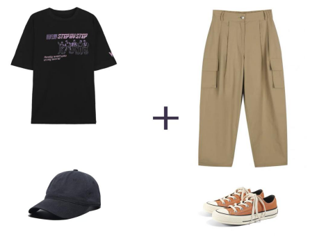 6、工裝褲+寬松短袖+鴨舌帽