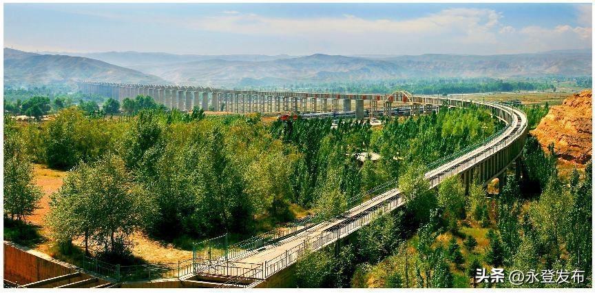 莊浪河渡槽。這是工程宏偉的建筑物之一,也是壯觀的景點之一。渡槽總長2194.8米,大凈空高度43米,共有76跨。無論其建筑規(guī)?;蛘咻斔芰Γ加衼喼薅刹壑拿雷u。渡槽橫跨莊浪河、蘭新鐵路、312國道、漢長城和明長城,形成了“六龍聚匯”的壯麗景觀。在同一空間,飽涵了兩千余年的歷史時空,實屬罕見。