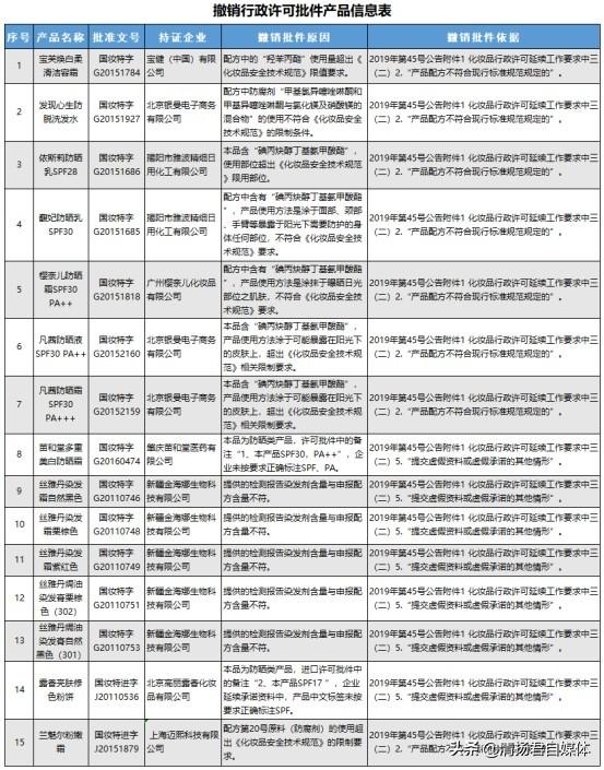 15個(gè)特證被撤銷的依據(jù)主要是2019年第45號(hào)公告附件1 化妝品行政許可延續(xù)工作要求中三(二)【2.“產(chǎn)品配方不符合現(xiàn)行標(biāo)準(zhǔn)規(guī)范規(guī)定的”?!亢汀?.“提交虛假資料或虛假承諾的其他情形”】。