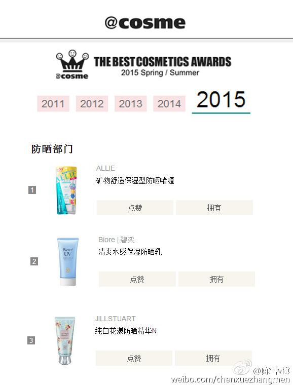 2015上半年日本暢銷防曬霜COSOME大賞--新的COSME彩妝大賞出爐了,作為日本的彩妝護(hù)膚品排行榜單上榜的產(chǎn)品均為好用及銷量并重的口碑品。小編會(huì)分類給大家介紹分析下。今天先說防曬篇: