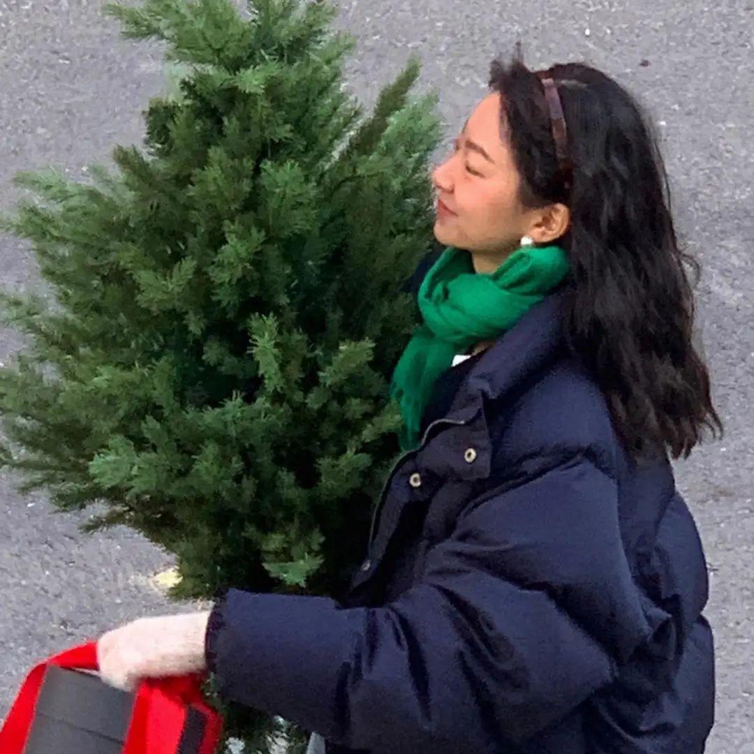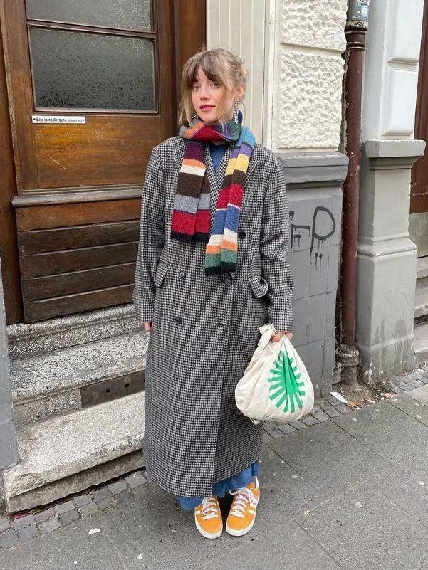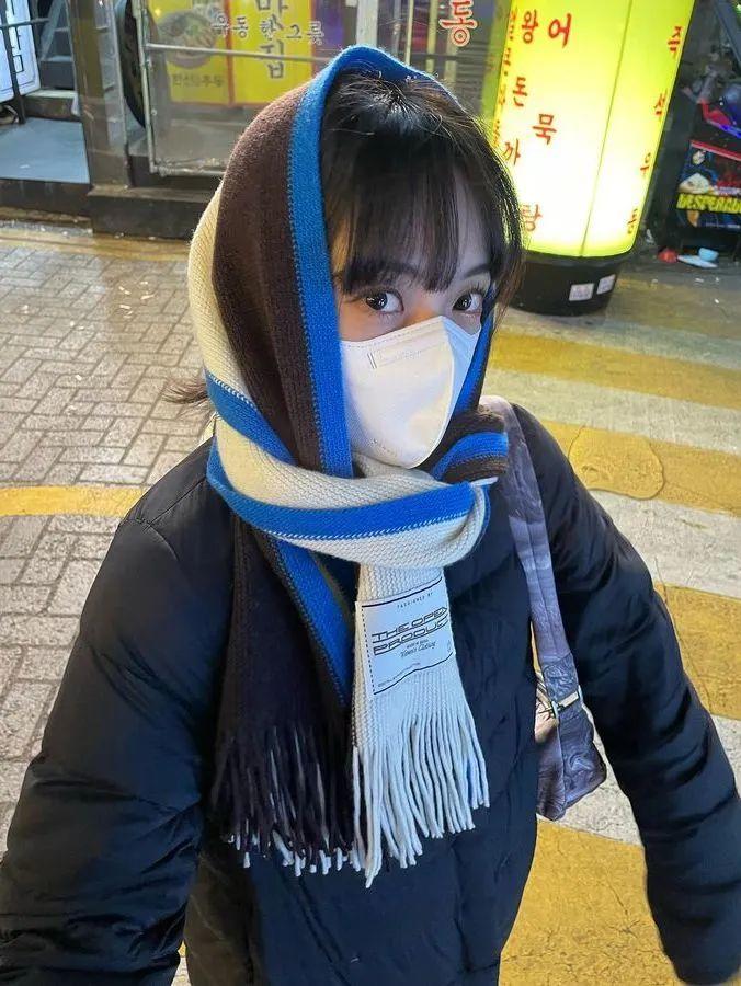 韓國博主們把窄幅圍巾戴出了新花樣,超短款的戴法看起來俏皮可愛,就算穿上厚重的羽絨服也足夠輕巧。充滿節(jié)日氛圍的格紋圍巾就很適合這個(gè)戴法,不會顯得老氣。