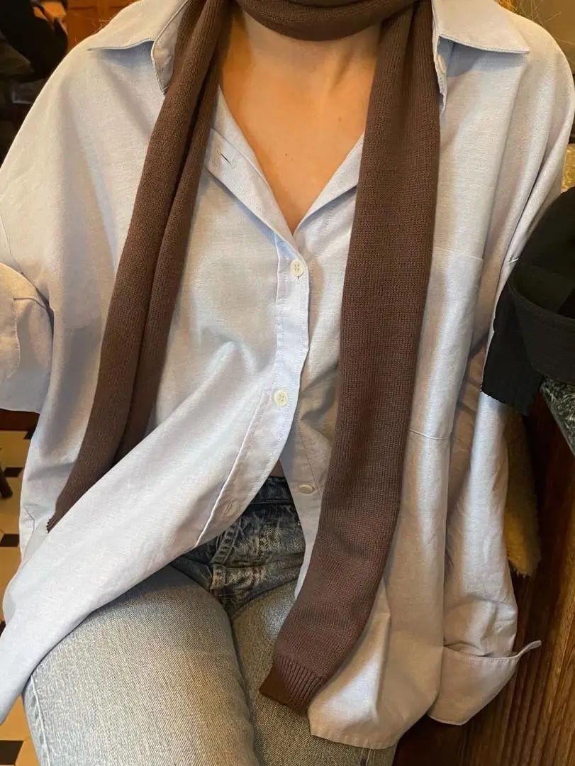 窄幅圍巾很適合搭配一些露膚面積比較大的內(nèi)搭,它可以讓頸部的露膚在秋冬季節(jié)看起來不會太過突兀,平衡上半身和下半身的分量感。