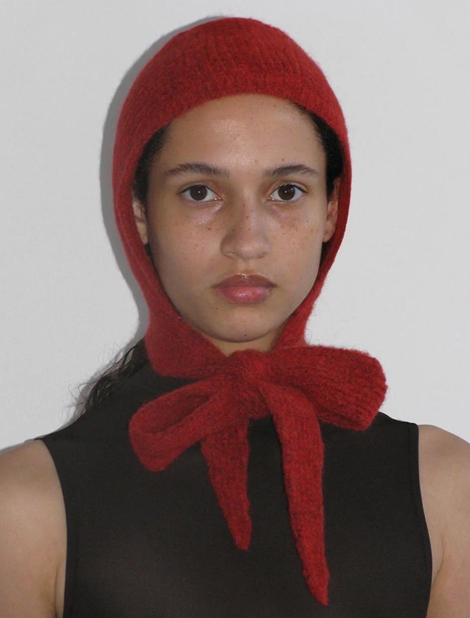今年火的巴拉克拉法帽還得是來自西班牙的針織品牌Paloma Wool,這頂針織小紅帽借用了巴拉克拉法帽的形態(tài),但通過系帶的方式讓佩戴更加隨意。雖然沒有了原本的強(qiáng)包裹性,但寬松的樣子適用于更多臉型。