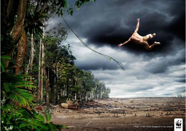 WWF組織環(huán)保廣告,人猿泰山要摔大跟頭了,廣告語(yǔ):熱帶雨林正在以每分鐘15平方公里的速度消失