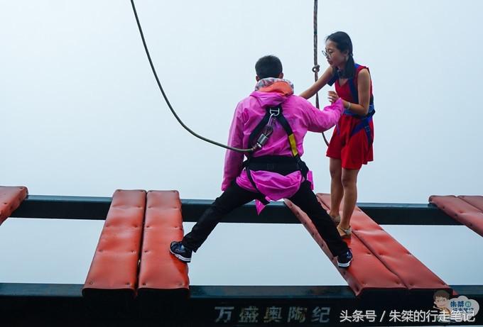 看到很多游客排隊的畫面,這個項目是僅次于懸崖秋千火的項目。人雖然是吊著保險繩走過去,但是越到后面人在上面會越?jīng)]有感,大多數(shù)人在后面難度升級的地方就會放棄不敢嘗試的,尤其是女生。這個項目也是抖音上火的三大項目之一,出現(xiàn)頻率多的是挑戰(zhàn)到中途不敢挑戰(zhàn)等著工作人員來解救的畫面,走在上面的可謂是真正的“步步驚心”!