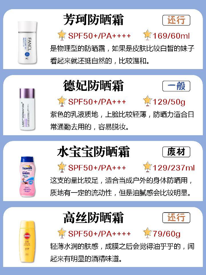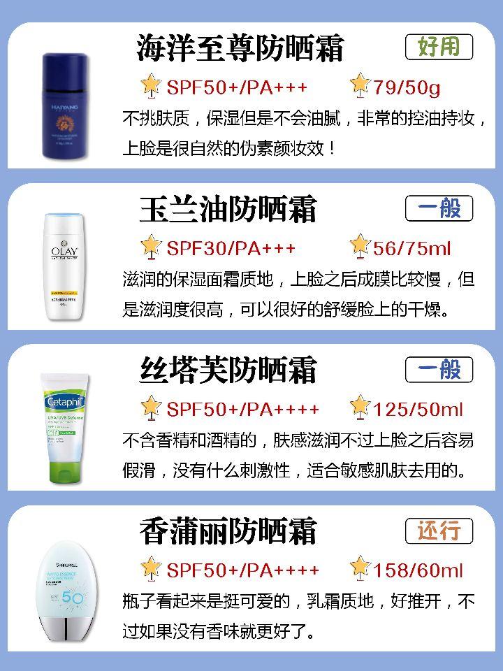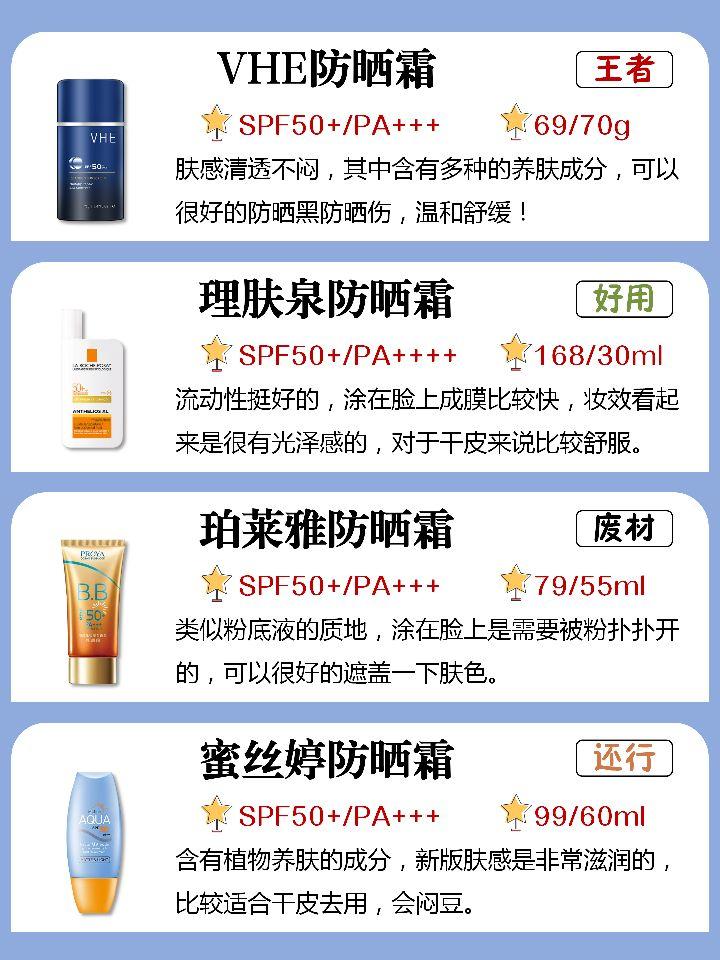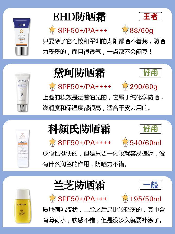 安耐曬、倩碧、曼秀雷敦,這幾個(gè)牌子的防曬霜比較好用,價(jià)位低,性價(jià)比高。