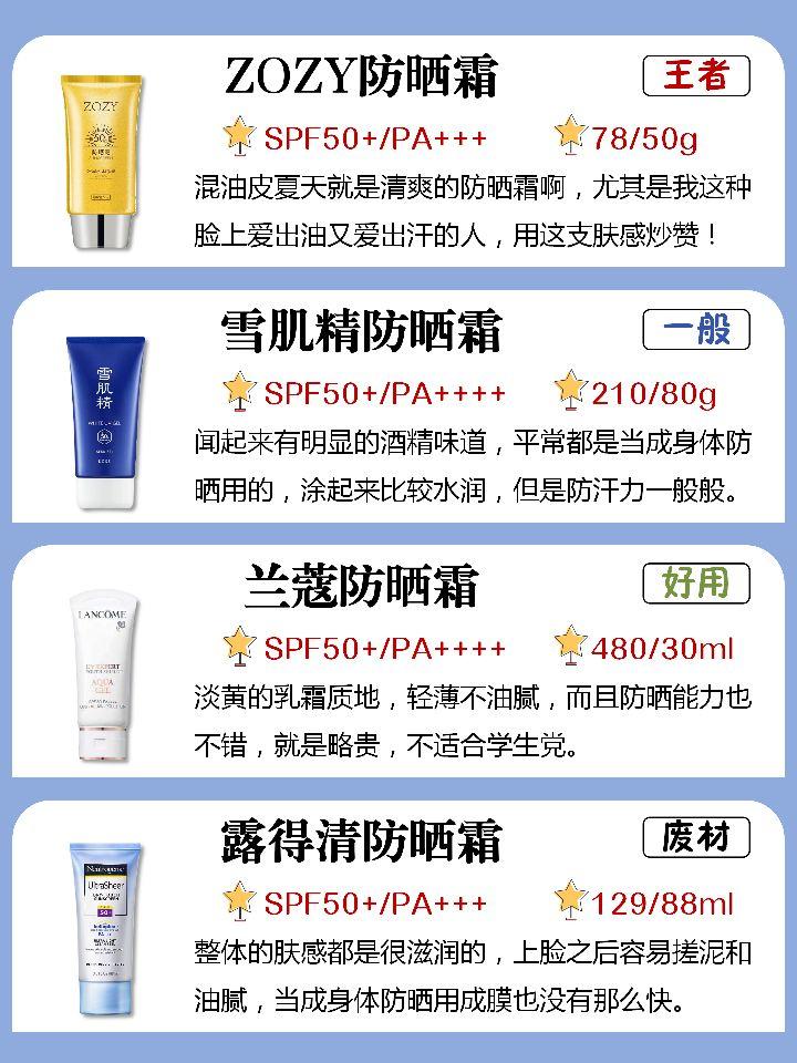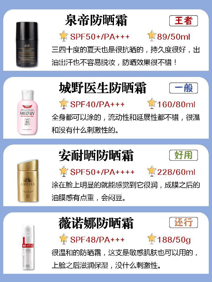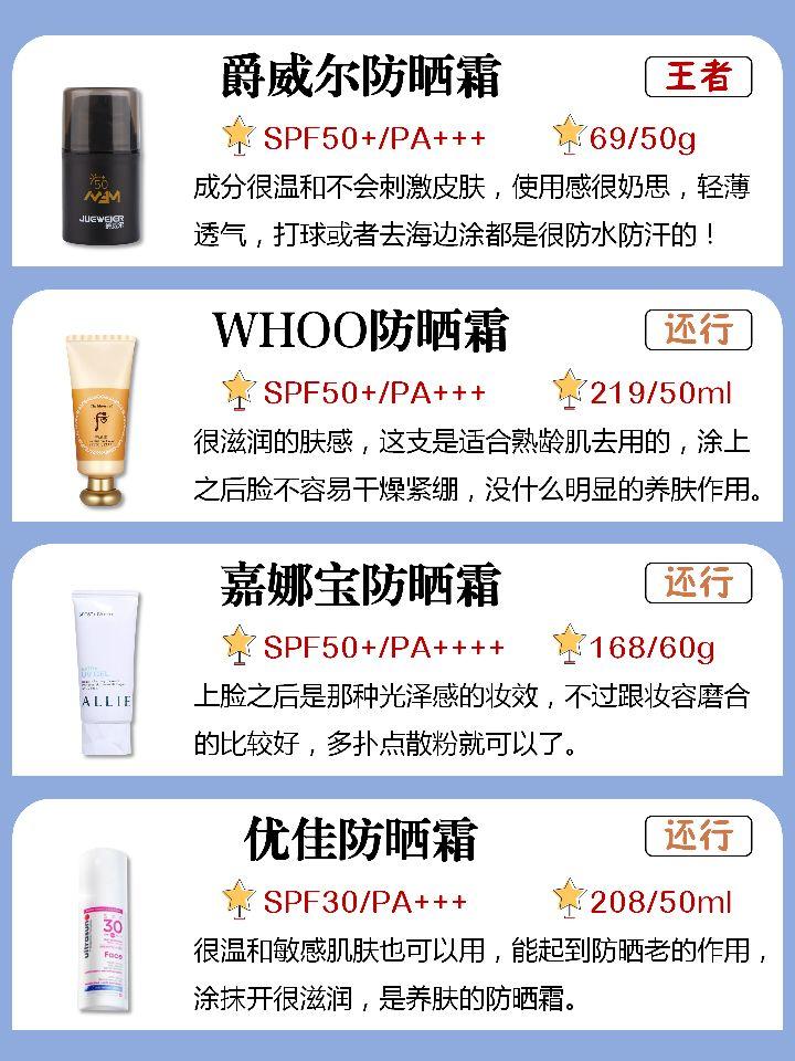 個(gè)人覺(jué)得,百雀羚和水密碼的防曬霜還是比較好用的,能夠更好的阻礙紫外線對(duì)肌膚的侵襲,能夠更好的保護(hù)我們的皮膚。資生堂安熱沙防曬乳。這款防曬霜可以說(shuō)是老牌子了,不僅防曬能力超強(qiáng),用完可以讓你一個(gè)夏天不曬黑,而且它的質(zhì)地也很適合各種膚質(zhì)。碧柔防曬霜。這款防曬霜不僅水潤(rùn)清透,用完一點(diǎn)都不黏膩,而且價(jià)格也很平價(jià),防曬能力也超強(qiáng)。