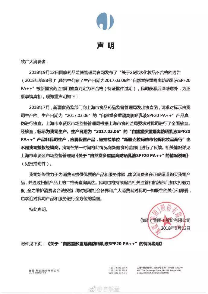 9月12日,藥監(jiān)局官網(wǎng)發(fā)布“關(guān)于26批次化妝品不合格的通告(2018年第88號(hào))”的通告。其中,伽藍(lán)(集團(tuán))股份有限公司(以下簡稱伽藍(lán)集團(tuán))生產(chǎn)的自然堂多重隔離防曬乳液SPF20PA++被列為其中。