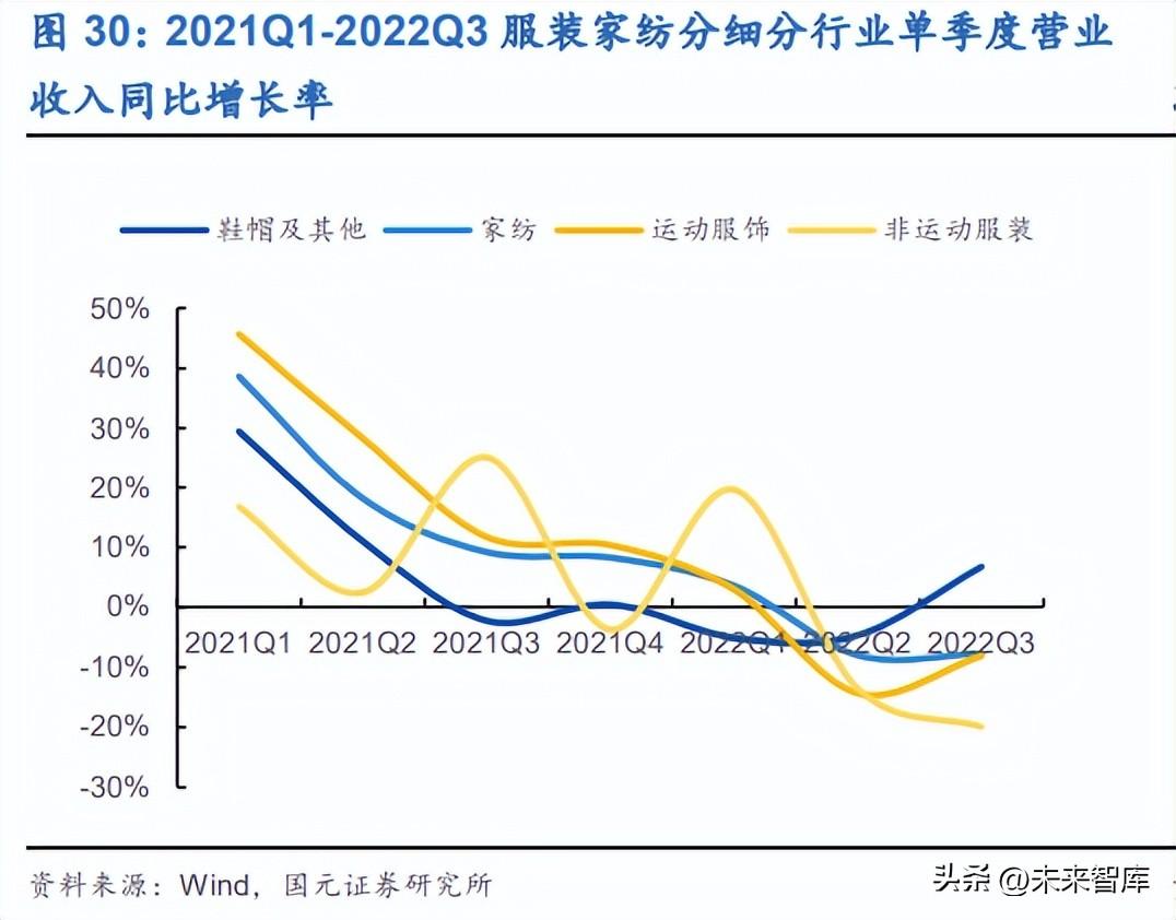 4、品牌服飾:服飾消費有望回暖,生活戶外成常態(tài)化需求時尚服飾方面,2022 年受國內(nèi)疫情影響,購物中心尤其是中購物中心的客流下 降。隨著疫情管控放松,線下零售消費需求或逐步恢復,前期受損嚴重的中 購物中心客流回升彈性更大,而主要布局在此的中高端服飾品牌業(yè)績有望迎來較大 彈性的修復。在 2022Q3 整體時尚服飾品類開關店比僅為 0.63 的情況下,比音勒芬、 歌力思、欣賀股份等中高端服飾品牌仍然保持了較為穩(wěn)定的門店數(shù)量,隨著疫后消費 復蘇和部分品牌出清,門店數(shù)量穩(wěn)定的中高端品牌服飾或受益更。從行業(yè)零售額 同比增速及產(chǎn)成品存貨同比增速來看,行業(yè)目前處于主動去庫存階段,隨著消費需求 逐漸恢復,品牌和經(jīng)銷商信心恢復,零售額和存貨狀態(tài)或出現(xiàn)好轉(zhuǎn),邁入復蘇期。