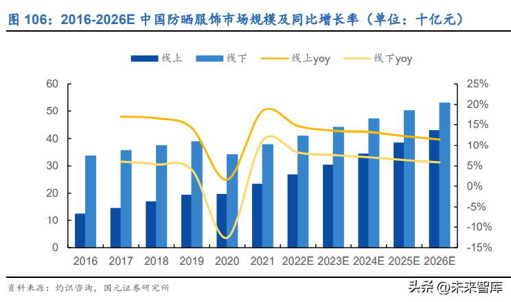 防曬服飾作為生活戶外一大細分賽道,迎來新發(fā)展機遇。在日常通勤、休閑運動、踏 青遠足、旅行度假等場景下,消費者對抗衰老和皮膚保護意識提高,相較于防曬霜, 防曬服飾具有無毒無害無刺激性可穿戴等優(yōu)點,再加上色彩款式的迭代創(chuàng)新,推動中 國防曬服飾行業(yè)市場規(guī)模增長。根據(jù)灼識咨詢,中國防曬服飾行業(yè)市場規(guī)模從 2016 年的 459 億人民幣增至 2021 年的 611 億人民幣,2016-2021 年 CAGR 為 5.9%, 預計 2026 年將達 958 億元,2021-2026 年 CAGR 為 9.4%。