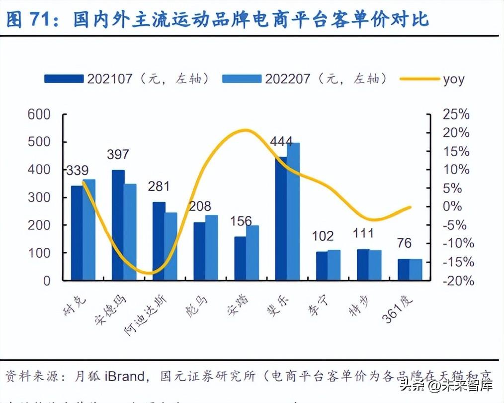 而隨著國產(chǎn)品牌 在產(chǎn)品品質(zhì)、專業(yè)技術方面的持續(xù)升級,消費者對于國產(chǎn)運動服飾的觀念發(fā)生轉(zhuǎn)變, 從原來認為國貨是低價平替產(chǎn)品、體現(xiàn)愛國情懷,到更關注產(chǎn)品的款式、風格、質(zhì)量, 也更愿意為國產(chǎn)品牌支付溢價。根據(jù)月狐 iBrand 數(shù)據(jù),2022 年 7 月,安踏/斐樂/李 寧的電商客單價分別為 197/496/108 元,分別同比增長 20.7%/10.5%/5.2%。我們認 為,隨著國產(chǎn)運動服飾產(chǎn)品矩陣完善、功能性細分化及消費者對運動品質(zhì)的更高要求, 國產(chǎn)運動服飾的產(chǎn)品消費均價有望進一步提升。