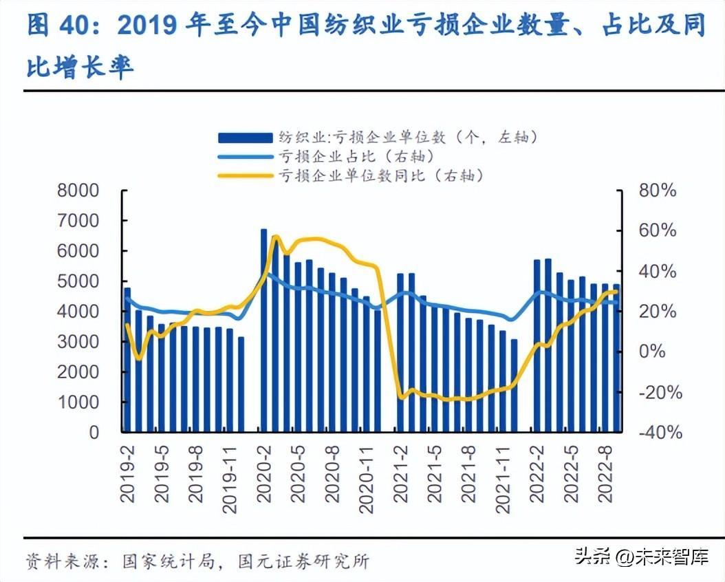 疫情及宏觀環(huán)境影響下,紡織行業(yè)低產(chǎn)能或逐步出清。根據(jù)工信部數(shù)據(jù),2022 年 1-9 月,中國規(guī)模以上紡織企業(yè)工業(yè)增加值同比下降 0.4%,營業(yè)收入 38563 億元, 同比增長 3.1%;利潤總額 1345 億元,同比下降 24.0%;行業(yè)虧損面 24.3%,同比 擴大 2.7pct。疫情及宏觀環(huán)境影響下,經(jīng)營困難的紡服企業(yè)數(shù)量同比大幅提升,持續(xù) 虧損下或逐步退出行業(yè),而頭部企業(yè)更有抵御經(jīng)營風險的經(jīng)驗和能力,更有望抓住疫情放開和經(jīng)濟回暖之后的行業(yè)機會。