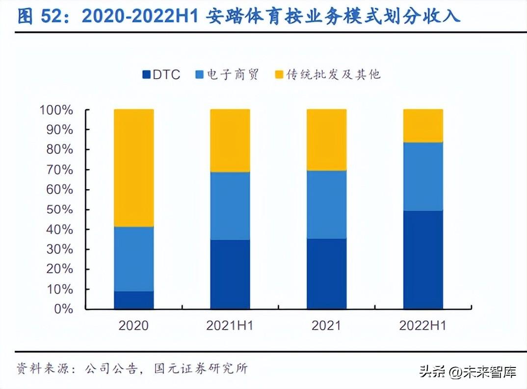 重視 DTC 運營,推進零售化改革。DTC 模式能夠幫助公司實現(xiàn)與終端零售的高打 通,更好地監(jiān)控及分配門店庫存,靈活調(diào)整零售折扣,快速回應消費者需求。安踏自 2020 年 8 月啟動 DTC 模式轉(zhuǎn)型,根據(jù)安踏體育公司公告,截至 2022H1,公司已在 21 個省市采用混合運營模式,在 DTC 模式下,總計約 6600 家安踏及安踏兒童門店 中,約 52%由公司直營,48%由加盟商按標準運營;DTC 收入為 66.47 億元,同比 增長 79.3%,占總收入的比例為 49.7%,同比提升 14.7pcts。