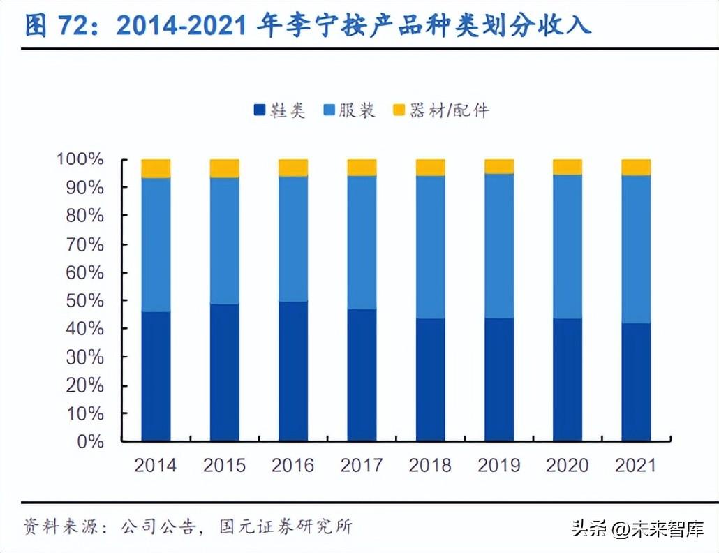 國產(chǎn)運動服飾品牌產(chǎn)品矩陣多元化,價格帶呈現(xiàn)上移趨勢。隨著國產(chǎn)運動服飾品牌 功能性與時尚感取得突破,一方面,逐步建立起多元化的低中高端品牌&產(chǎn)品矩陣, 給予消費者更多元化的消費選擇;另一方面,以高科技運動鞋為基礎提升品牌調(diào)性, 帶動服飾、器材及配件等銷售占比的提升,進一步擴大銷售范圍。