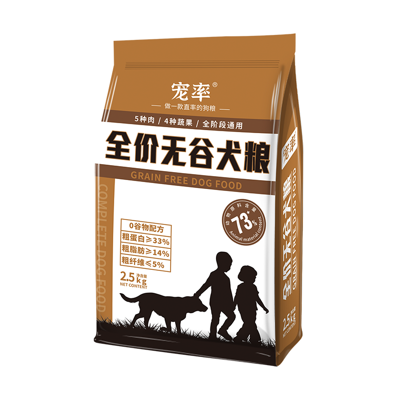 第五階段:不含谷類原料如玉米、小麥、豆粕、燕麥、大米及相應(yīng)的副產(chǎn)品,而利用鮮肉、土豆等高能、低敏感度原料的狗糧稱為無谷狗糧。