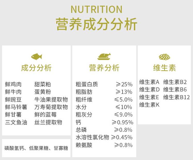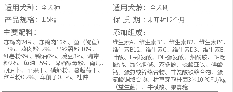 而且蛋白質(zhì)含量也高,粗蛋白含量高達36%,粗脂肪22%,水分9%、鈣磷比為1.5,完全可以滿足狗狗生長發(fā)育所需要的營養(yǎng),無任何肉粉及內(nèi)臟等副產(chǎn)物添加,不含谷物,真材實料,同時減少寵物腸胃負擔(dān),消化吸收的更好。