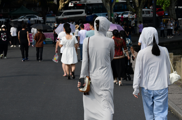 這幾天,每當(dāng)上班出門前,杭州姑娘方夢琴都會先擦上防曬霜,再穿好加長版防曬衣,把自己遮擋得嚴(yán)嚴(yán)實(shí)實(shí)?!敖栠@么烈,光擦防曬霜已經(jīng)不夠了。”方夢琴說。