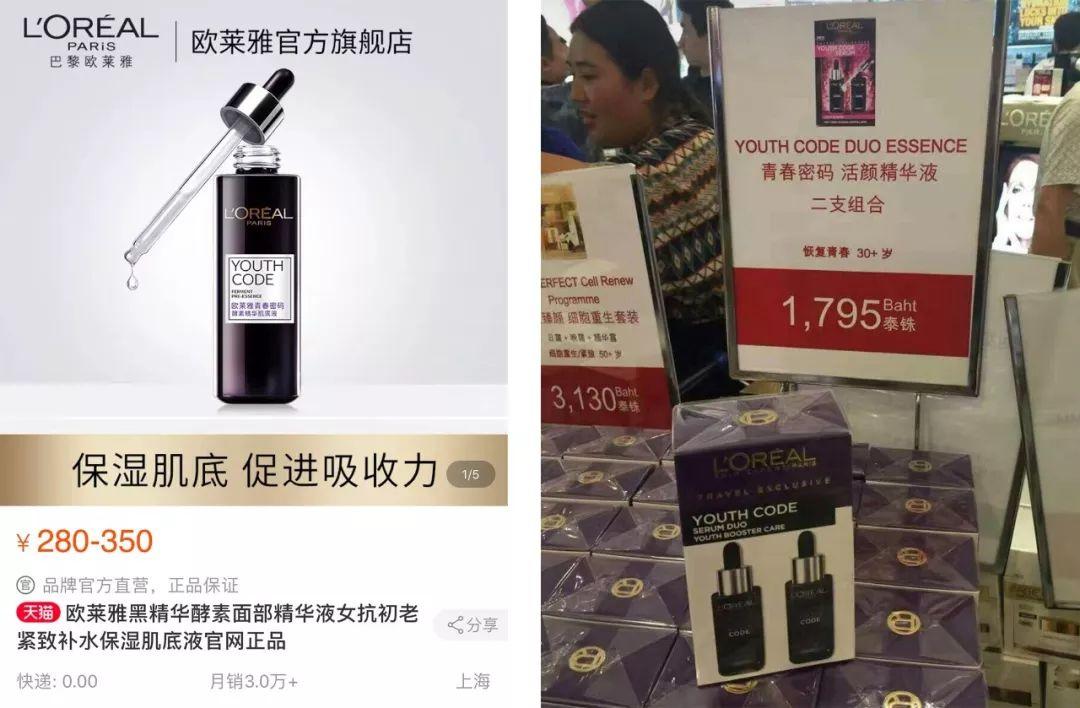 由于價格較低,泰國巴黎歐萊雅一般以套裝的形式出售,比如說青春密碼肌底液。國內官網售價280元一瓶,免稅店兩瓶只要1795泰銖(約359元)。