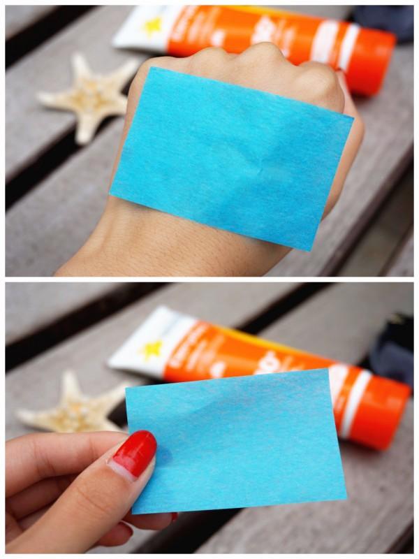 在選擇防曬品的時候怕的就是油膩厚重了,不但感受不適還會增加肌膚負擔。用吸油紙在使用過防曬霜的手背輕輕按壓數秒,發(fā)現吸油紙上幾乎沒有油分殘留,說明防曬霜清爽度不錯,即使油性肌膚使用也不會覺得太過油膩厚重。