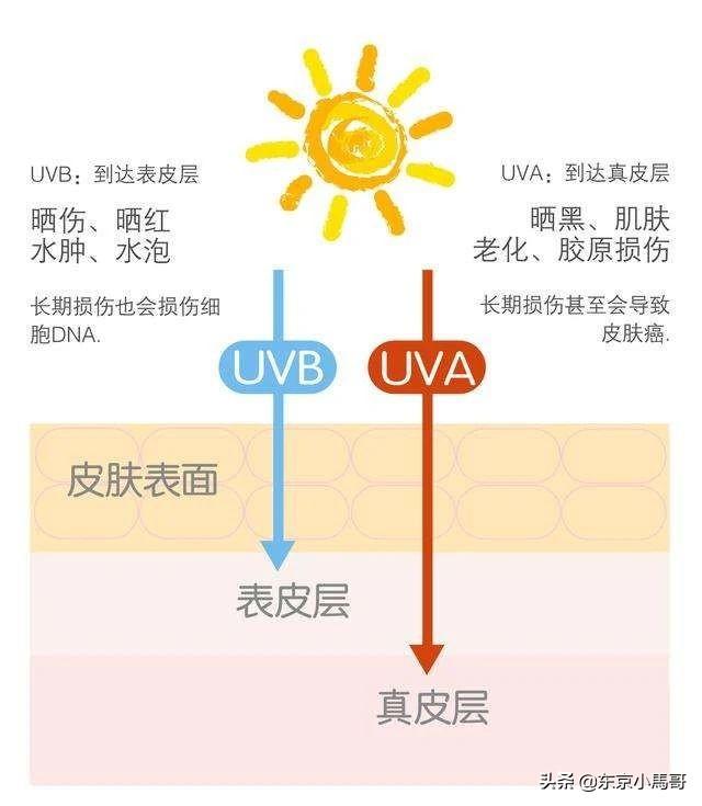 UVA可穿透層,使肌膚曬黑,并導(dǎo)致脂質(zhì)和膠原蛋白受損,引起肌膚的光老化甚至皮膚癌,UVB可到達層,使肌膚被曬傷,引起脫皮、紅斑等現(xiàn)象。
