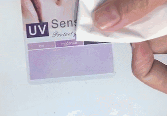 用到的道具是專業(yè)的紫外線測試卡片。它的原理是紫外線照射時會變色。