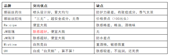 這7款噴霧中,有潤色效果的是娜麗絲院線,mistine,UH,其它4款都是透明質(zhì)地的。