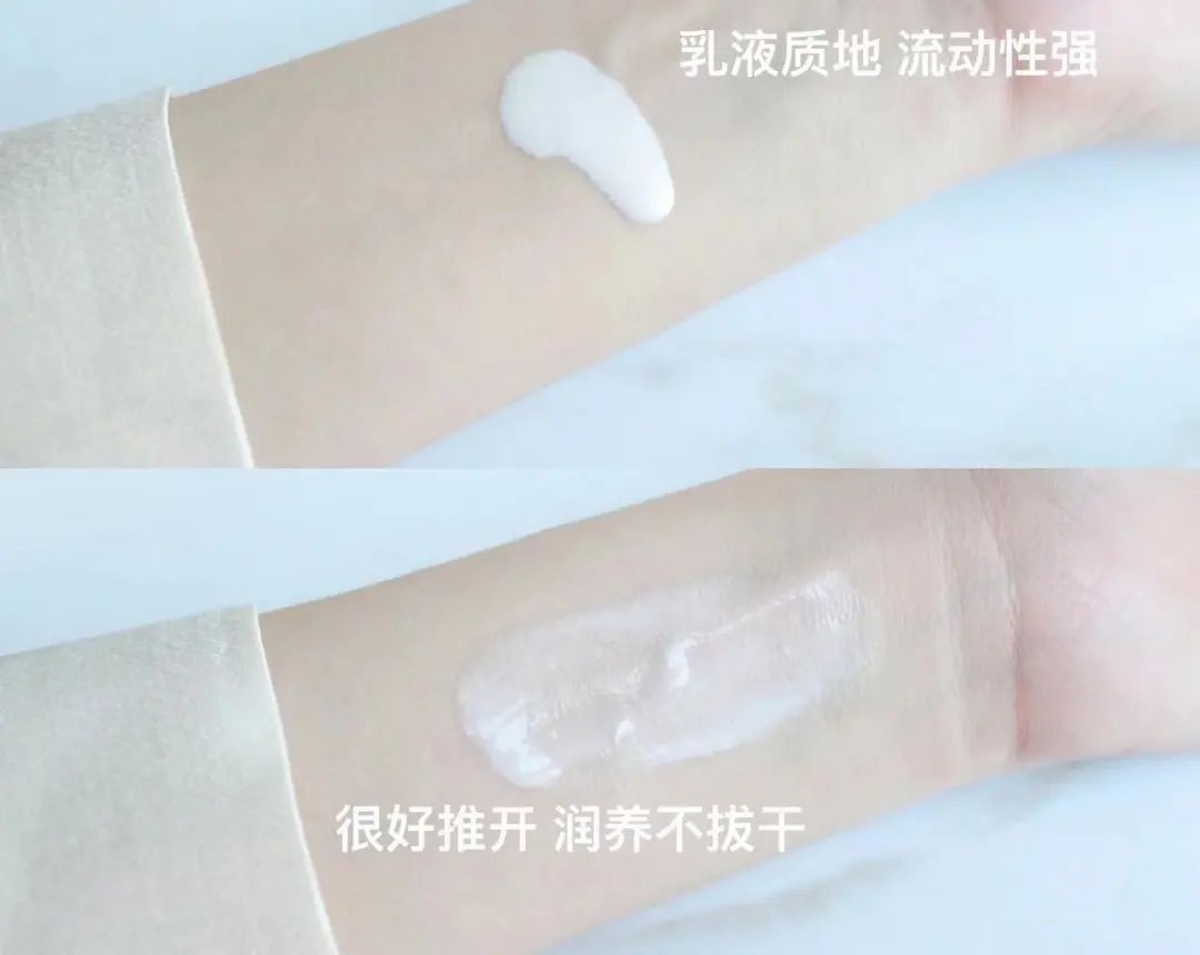 淡粉色的水漾質(zhì)地,流動(dòng)性好,涂在手臂上直接流了下去!肉眼可見(jiàn)的輕薄水潤(rùn),但完全不影響它的防曬力。