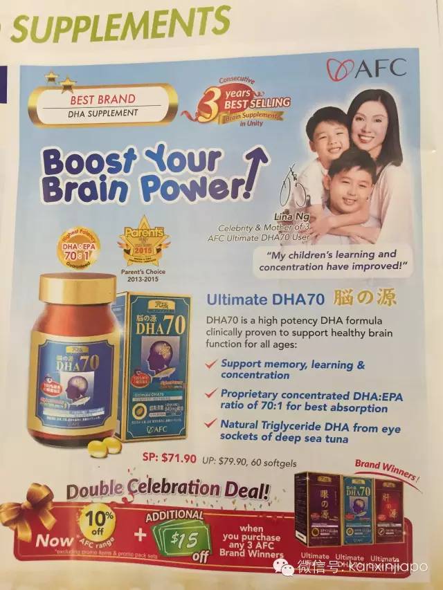 上榜折扣價:AFC DHA70補腦產(chǎn)品目前特價71.9新幣,補肝產(chǎn)品目前特價62.9新幣。如果買3瓶,則可享有10% 折扣,以及再減15新幣。
