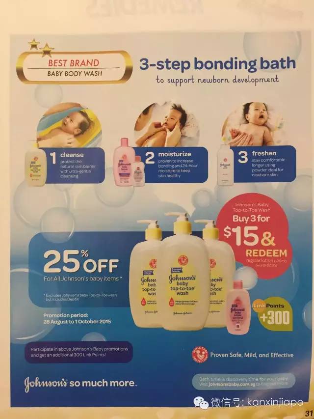 上榜折扣價:嬰兒頭到腳沐浴產(chǎn)品3瓶15新幣還送乳液,買25新幣強生旗下產(chǎn)品送5新幣強生旗下產(chǎn)品現(xiàn)金券