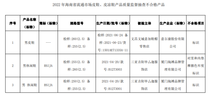 近期,海南省市場監(jiān)管局對全省流通市場皮鞋、皮涼鞋產(chǎn)品進(jìn)行了監(jiān)督抽查。本次抽查了20批次產(chǎn)品,經(jīng)檢驗,不合格3批次,不合格樣品具體信息為:意爾康股份有限公司生產(chǎn)的男皮鞋、廈門淘灘品牌管理有限公司生產(chǎn)的2批次“BSIJA”牌男休閑鞋。
