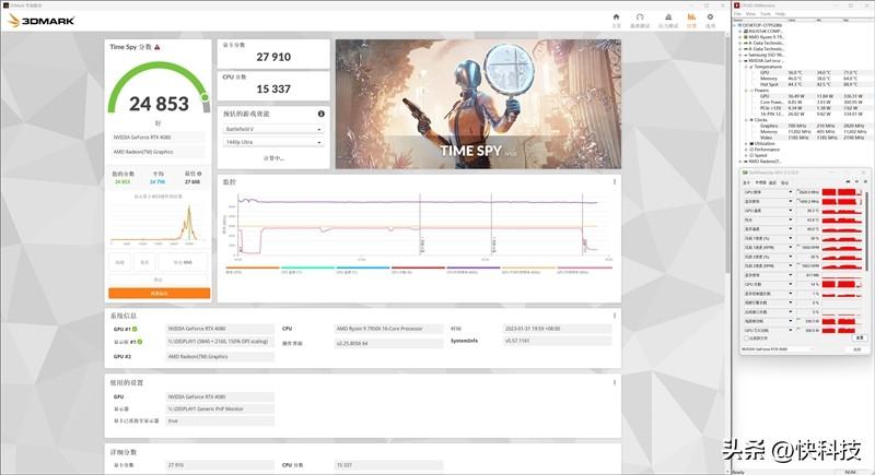 在3DMark的Time Spy(DX12+2K渲染分辨率)測試中,總成績?yōu)?4853,其中銘瑄RTX 4080璦珈顯卡的分?jǐn)?shù)為27910。