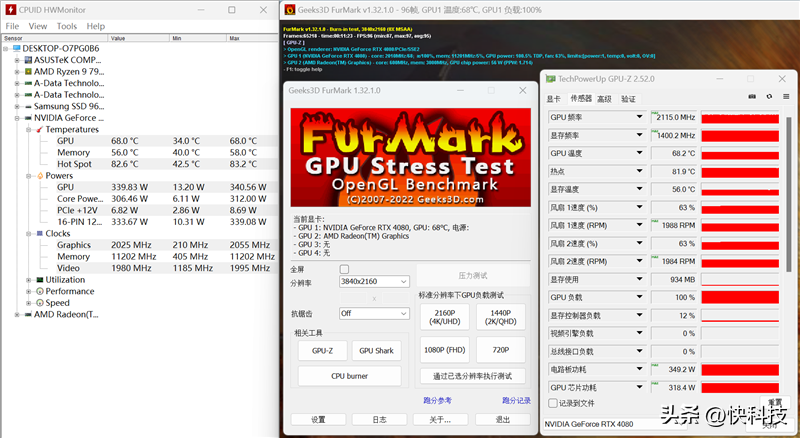 銘瑄RTX 4080璦珈顯卡烤機(jī)10分鐘后,GPU大頻率2115MHz,功耗在340W,溫度高為68攝氏度,風(fēng)扇轉(zhuǎn)速在2000 RPM左右。