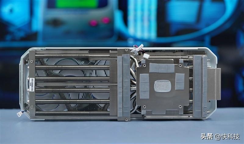 拆開背板,可以看到大面積高密度鰭片,配合4根6mm+4根8mm共8根復(fù)合式純銅熱管設(shè)計,加上鏡面式銅底,和前面的3風(fēng)扇,組成了M-Flow散熱系統(tǒng),可以能夠有效壓制GPU芯片發(fā)熱。