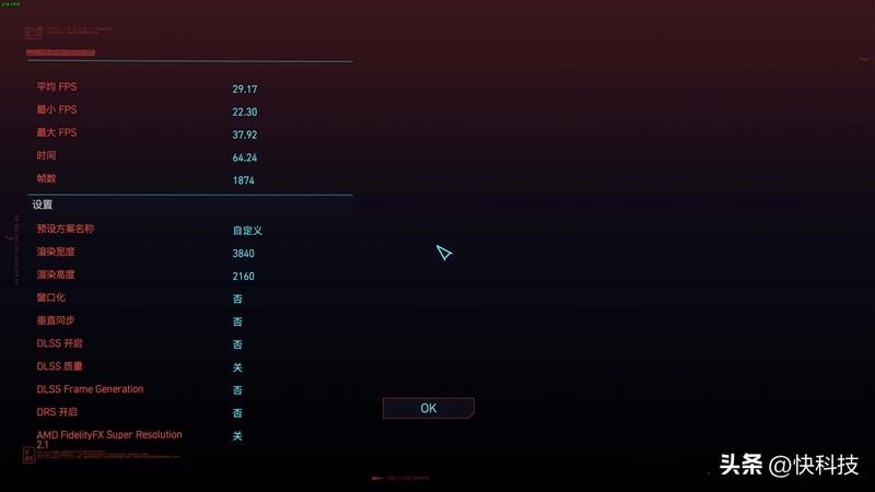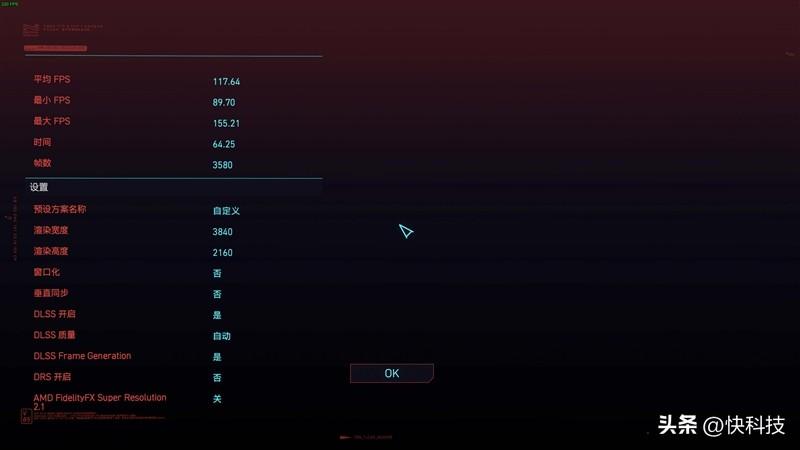 在《賽博朋克2077》4K+預(yù)設(shè)畫質(zhì)下,平均幀數(shù)為69.09 FPS。