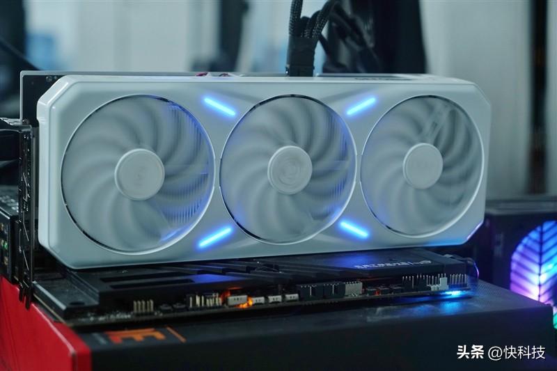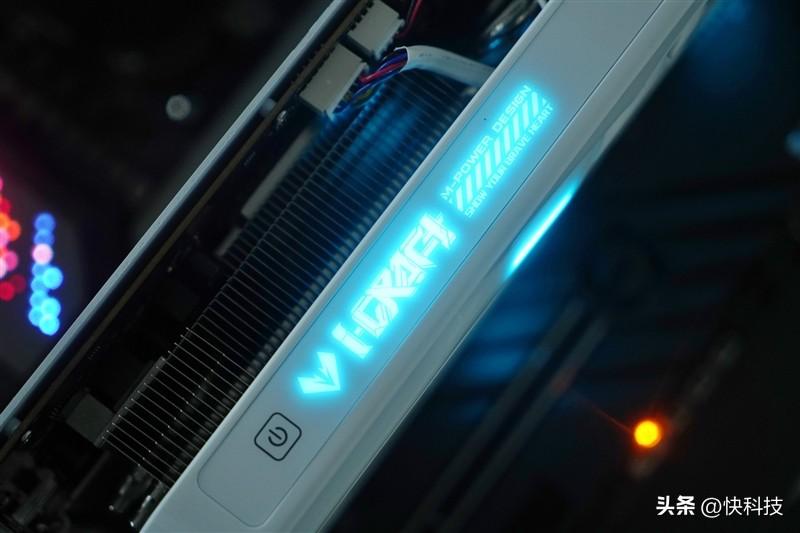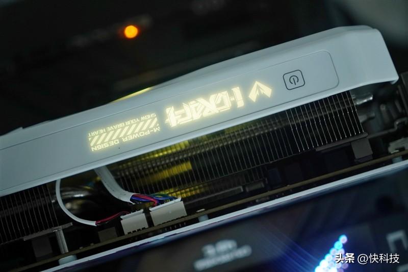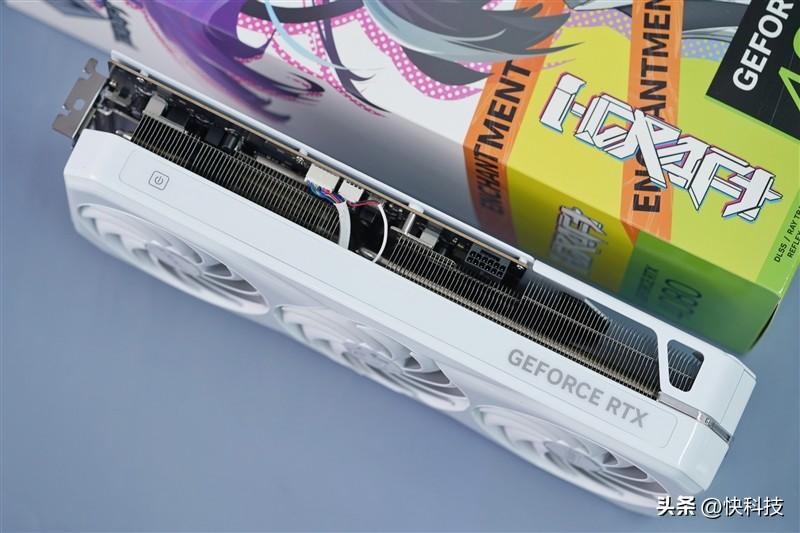 RTX 4080璦珈顯卡的背部,使用了定制RGB背板,合金背板搭配著藍(lán)紫色的璦珈新形象,與白色機(jī)身搭配,給人一種耳目一新、清新靚麗的視覺感受。