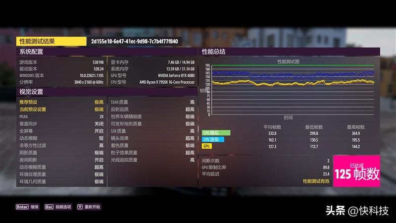 在《極限競速:地平線5》4K+極端畫質(zhì)下,平均幀數(shù)為125 FPS。