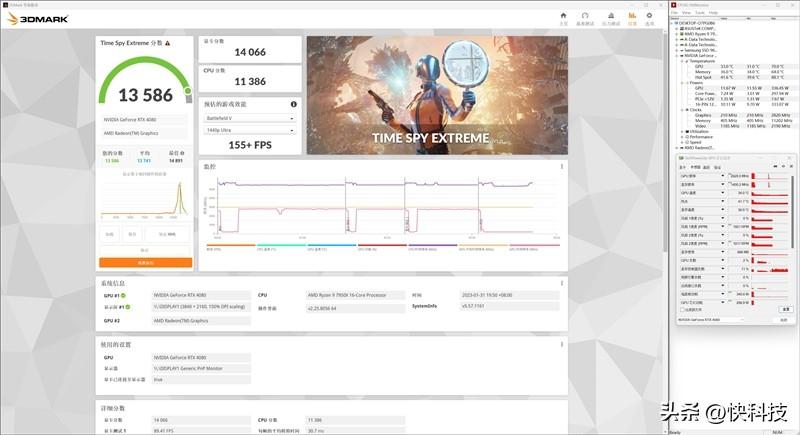 在3DMark的Time Spy Extreme(DX12+4K渲染分辨率)測試中,總成績?yōu)?3596,其中銘瑄RTX 4080璦珈顯卡的分?jǐn)?shù)為14066。