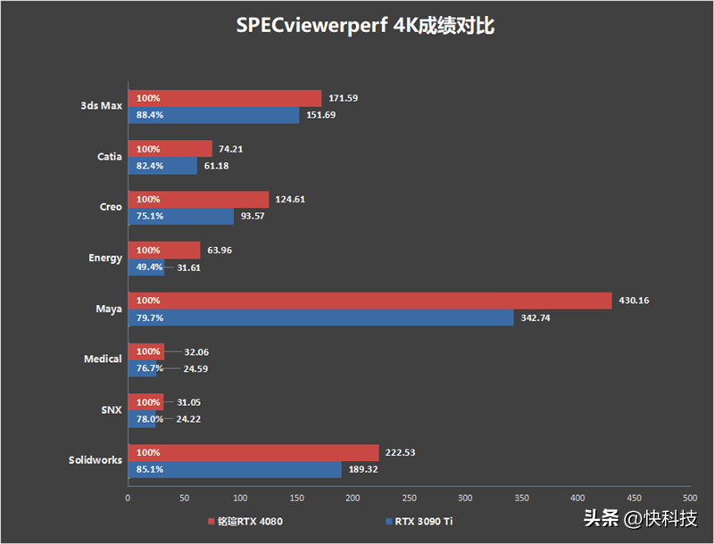 銘瑄RTX 4080璦珈顯卡在SPECviewperf的4K分辨率測試中,3dsmax得分為171.59、catia為74.21、creo為124.61、energy為63.96、maya為430.16、medical為32.06、snx為31.05、solidworks為222.53。
