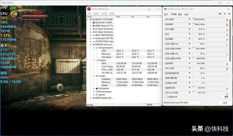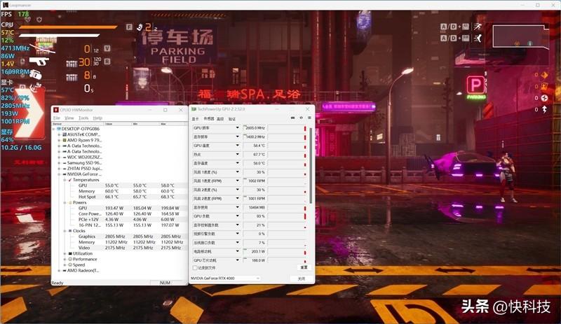 在2K分辨率下,當(dāng)前畫面的GPU頻率為2805MHz,顯存占用82%,功耗193W,溫度在55攝氏度。