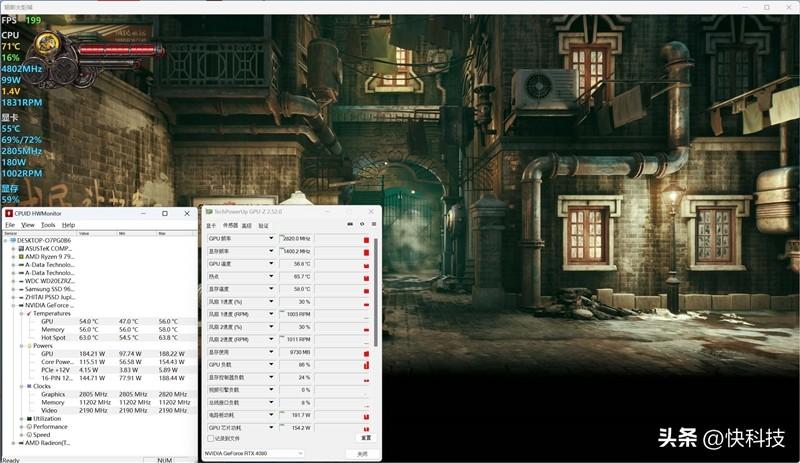 在2K分辨率下,當(dāng)前畫面的GPU頻率為2820MHz,顯存占用69%,功耗184W,溫度在54攝氏度。