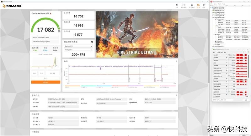 在3DMark的Fire Strike Ultra(DX11+4K渲染分辨率)測試中,總成績?yōu)?7082,其中銘瑄RTX 4080璦珈顯卡的分?jǐn)?shù)為16702。