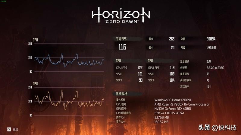 在《地平線:零之曙光》4K+預(yù)設(shè)質(zhì)量畫質(zhì)下,平均幀數(shù)為116 FPS。