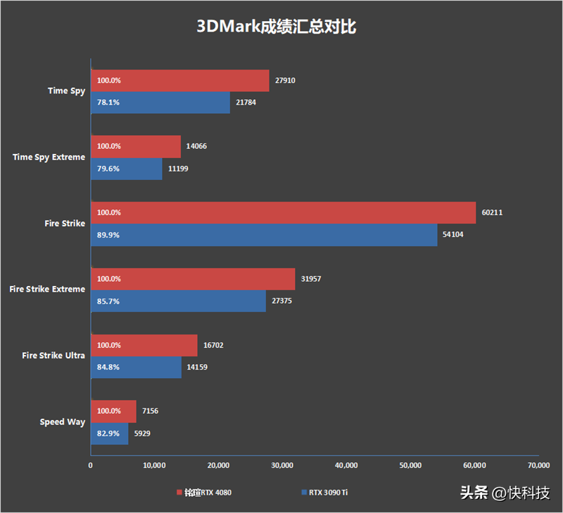在3DMark理論測試中,銘瑄RTX 4080璦珈顯卡整體領(lǐng)先上代卡皇RTX 3090 Ti約20%。