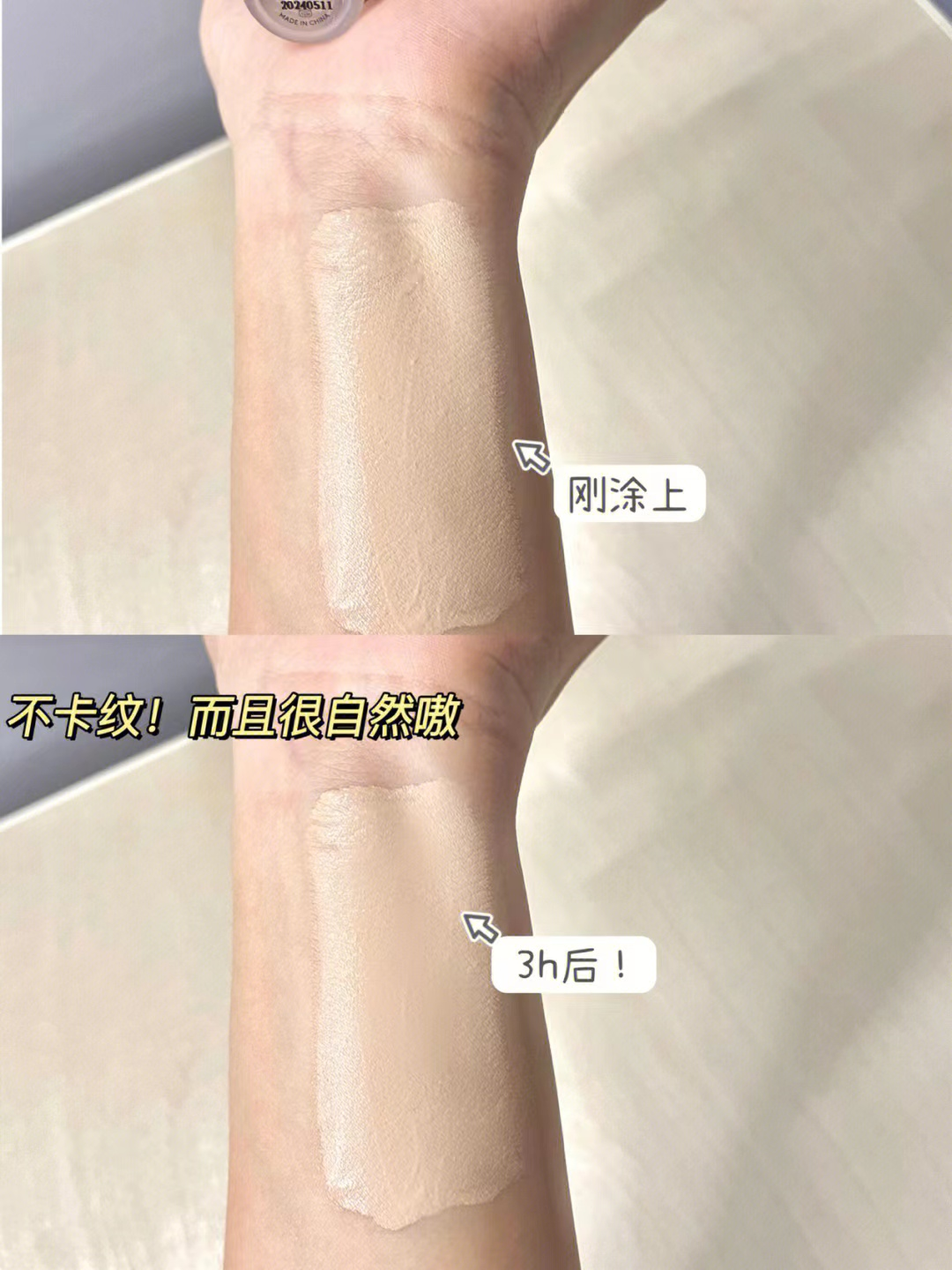 雖然它質(zhì)地很水潤,但是遮瑕力也不弱,暗沉、紅血絲和黑眼圈都可以遮住,在眼下嘴角這些容易卡紋的地方也很水潤,妝感自然。