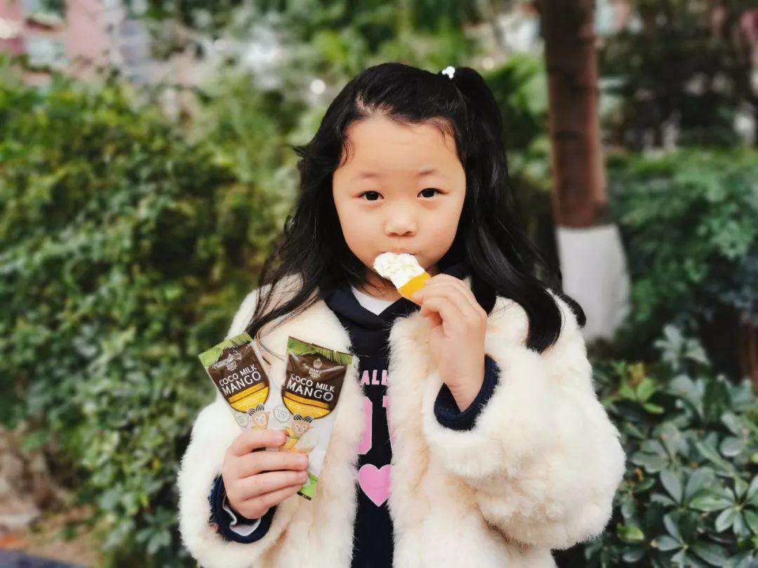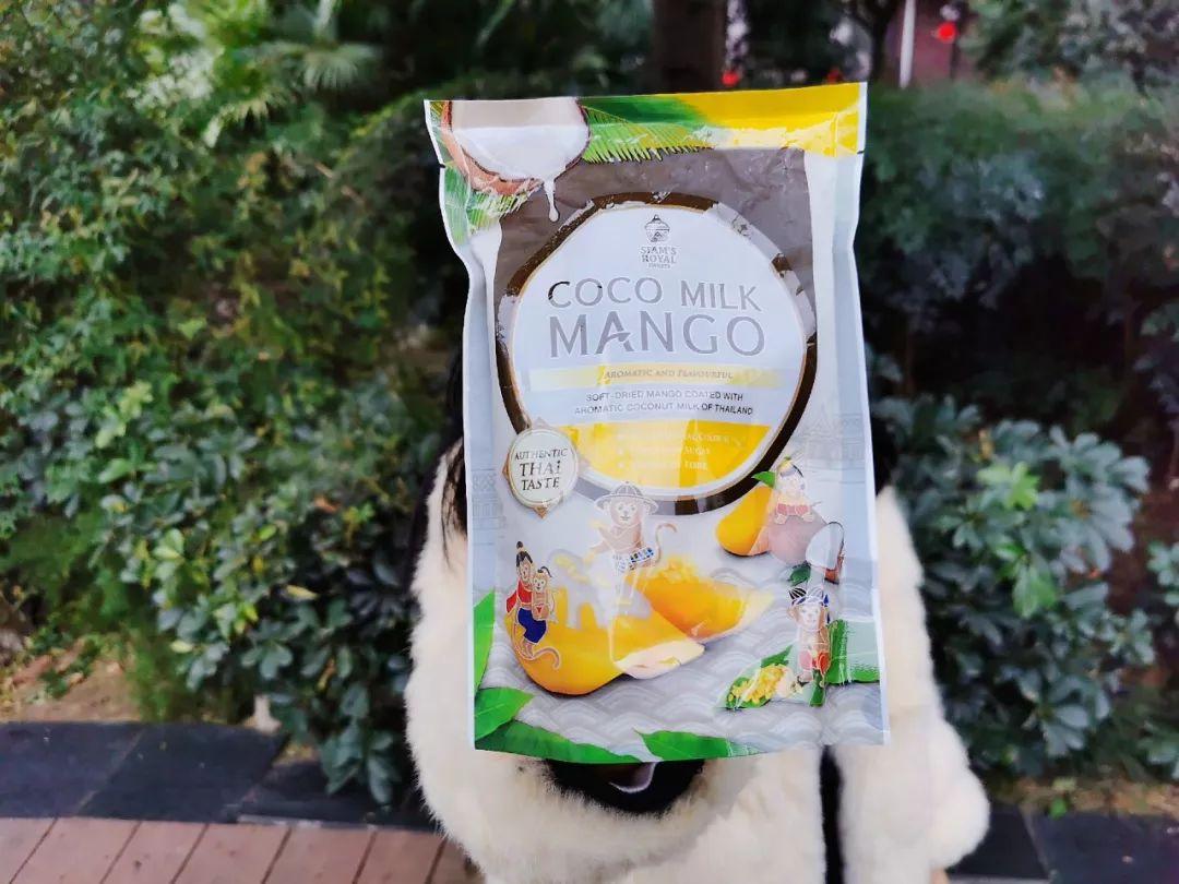 吃過很多品牌的芒果干,這個(gè)是特別的。它是芒果干上涂了臉特制的白巧克力椰奶醬,這樣的想法真的是很新奇了。
