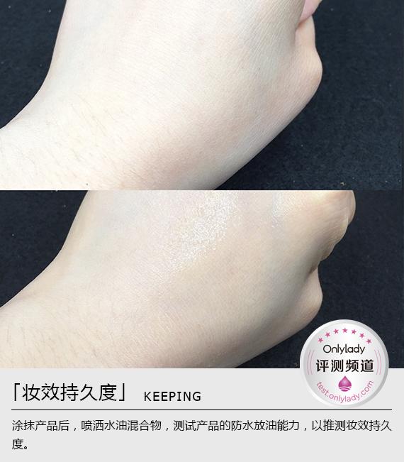 涂抹防曬后噴灑水油混合物,20分鐘后沒有出現(xiàn)浮粉、溶解等現(xiàn)象,且手背的水滴較大,說明此款防曬在遇到水之后不會影響防曬效果。這樣一來,在炎熱的夏天即使大汗淋漓也不用太擔(dān)心會花妝啦!持續(xù)防曬7.5小時(shí)可不是說說而已哦!