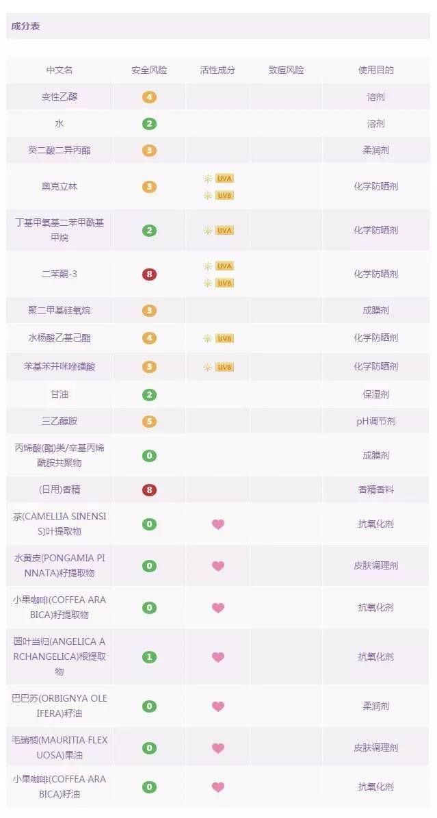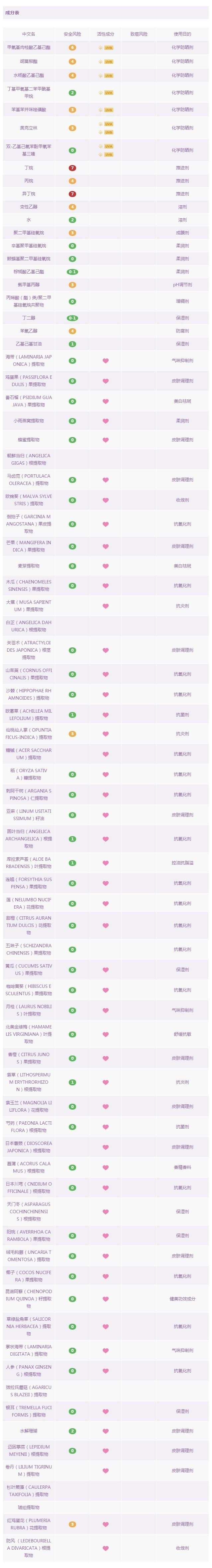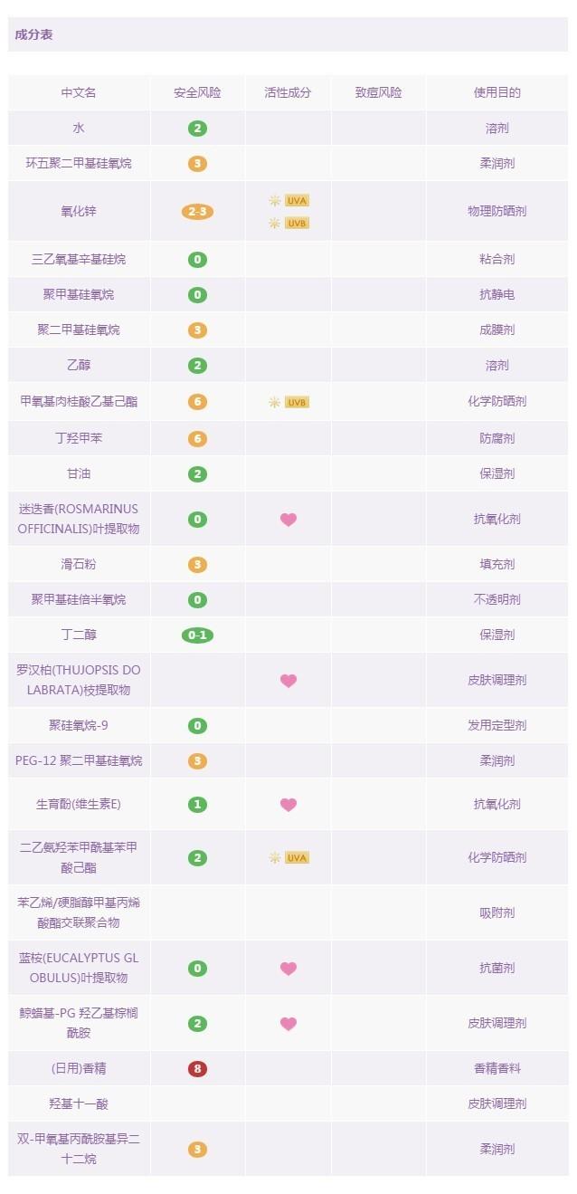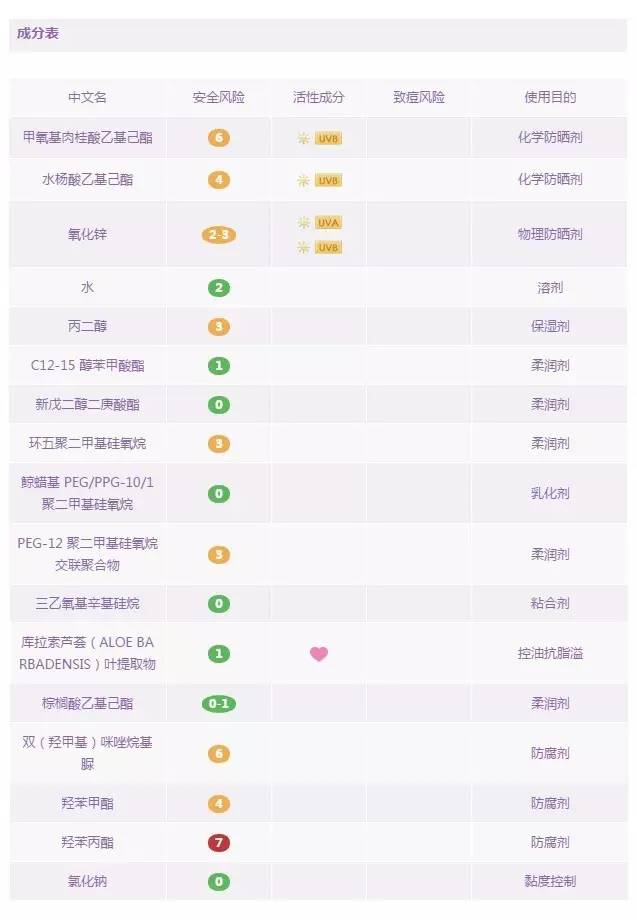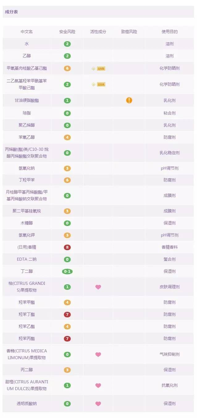 優(yōu)佳是瑞士的一款專業(yè)防曬藥妝品牌,也是瑞士皮膚科醫(yī)生推薦的防曬產(chǎn)品。這款面部專用防曬乳是由化學防曬劑和物理防曬劑共同搭配的產(chǎn)物。其中含四種化學防曬成分:奧克立林,丁基甲氧基二苯甲?;淄?,二乙基己基丁酰胺基三嗪酮,雙-乙基己氧苯酚甲氧苯基三嗪,和一種物理防曬成分:二氧化鈦 。這款產(chǎn)品難得的是:不含防腐劑,不含香料,不含高風險成分,以及孕婦慎用成分。這種難得在防曬產(chǎn)品中少見,因此,推薦給各位媽媽和寶寶們,讓它來守護你們,叔比較放心。但遺憾的是,里面依然含有乙醇,酒精過敏者還是小心一下吧。
