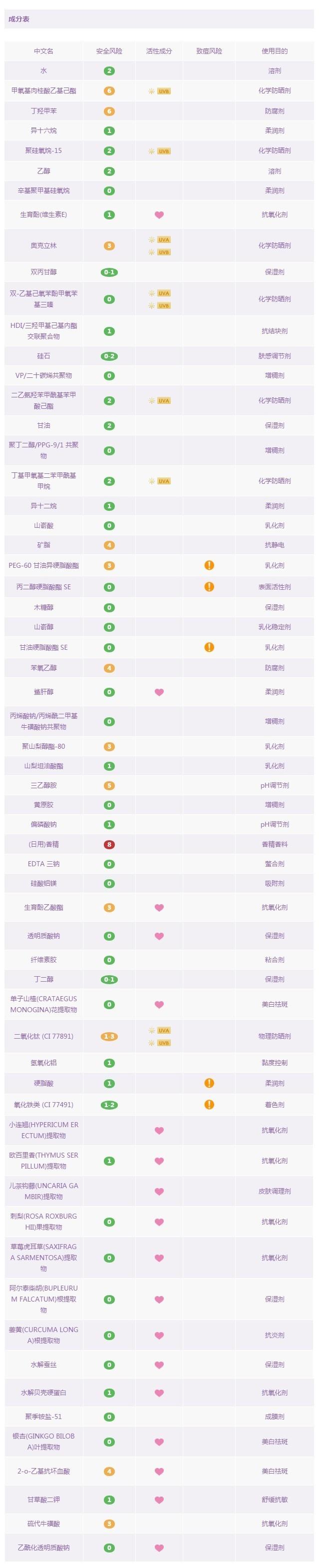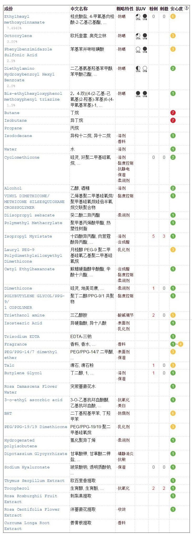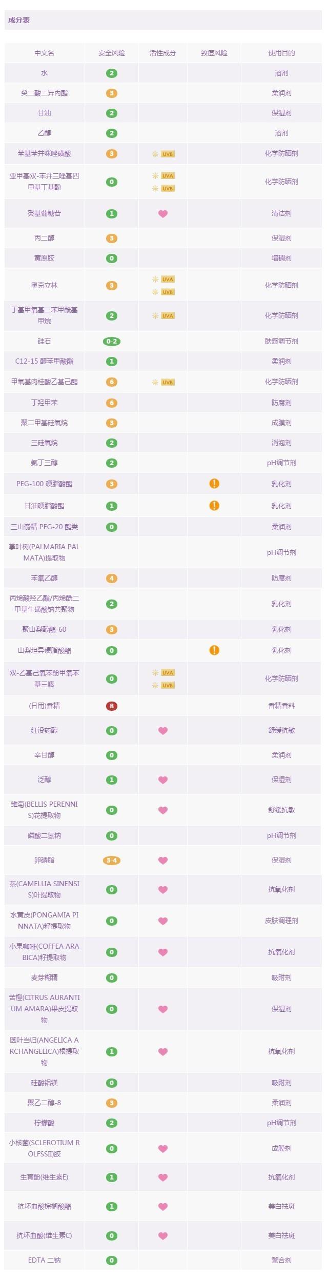 優(yōu)佳是瑞士的一款專業(yè)防曬藥妝品牌,也是瑞士皮膚科醫(yī)生推薦的防曬產(chǎn)品。這款面部專用防曬乳是由化學防曬劑和物理防曬劑共同搭配的產(chǎn)物。其中含四種化學防曬成分:奧克立林,丁基甲氧基二苯甲?;淄?,二乙基己基丁酰胺基三嗪酮,雙-乙基己氧苯酚甲氧苯基三嗪,和一種物理防曬成分:二氧化鈦 。這款產(chǎn)品難得的是:不含防腐劑,不含香料,不含高風險成分,以及孕婦慎用成分。這種難得在防曬產(chǎn)品中少見,因此,推薦給各位媽媽和寶寶們,讓它來守護你們,叔比較放心。但遺憾的是,里面依然含有乙醇,酒精過敏者還是小心一下吧。