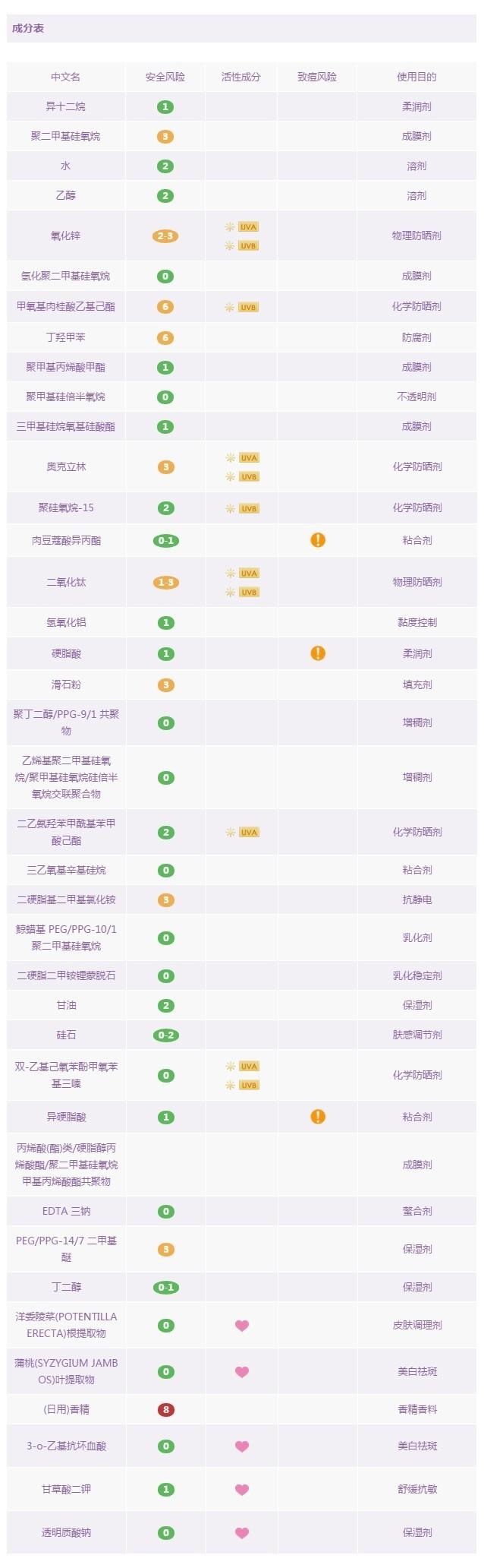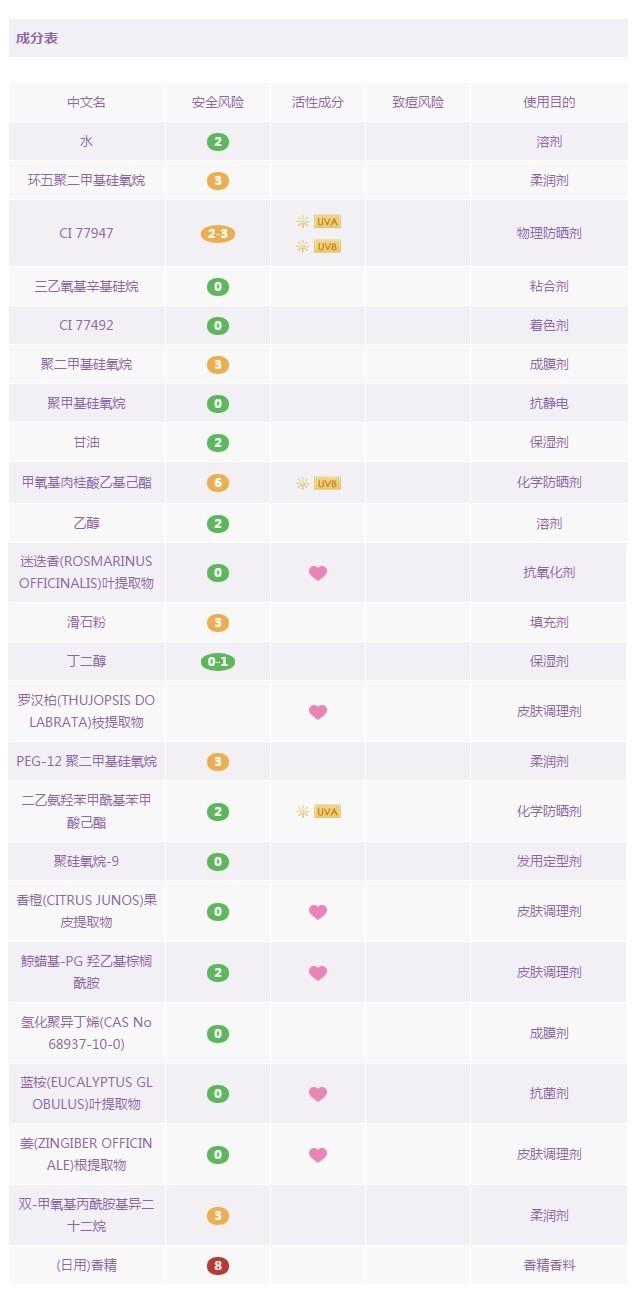 cpb是日本的高端護膚品牌,它bling~bling~的外包裝很容易讓人產(chǎn)生一種晃眼的貴婦感。那我們先來看看這款產(chǎn)品的成分是不是也這么bling~bling呢?它含6種化學防曬成分:甲氧基肉桂酸乙基己酯,聚硅氧烷-15,奧克立林,雙-乙基己氧苯酚甲氧苯基三嗪,二乙氨羥苯甲?;郊姿峒乎?,丁基甲氧基二苯甲?;淄椤?和1種物理防曬成分:二氧化鈦。防曬劑的紫外線波段配合比較且合理。之前說到奧克立林(Octocrylene)暴露在陽光下會釋放出氧自由基,于是其中加入了抗氧化的成分:維生素E(生育酚) ,且排在成分表比較靠前的位置,可以看出用料的良心,以及一系列的活性提取物的添加,也讓這款產(chǎn)品在防曬+修色的同時,同樣可以作為一款日間護膚品使用。