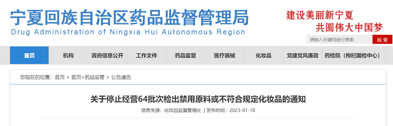 關于停止經(jīng)營64批次檢出禁用原料或不符合規(guī)定化妝品的通知